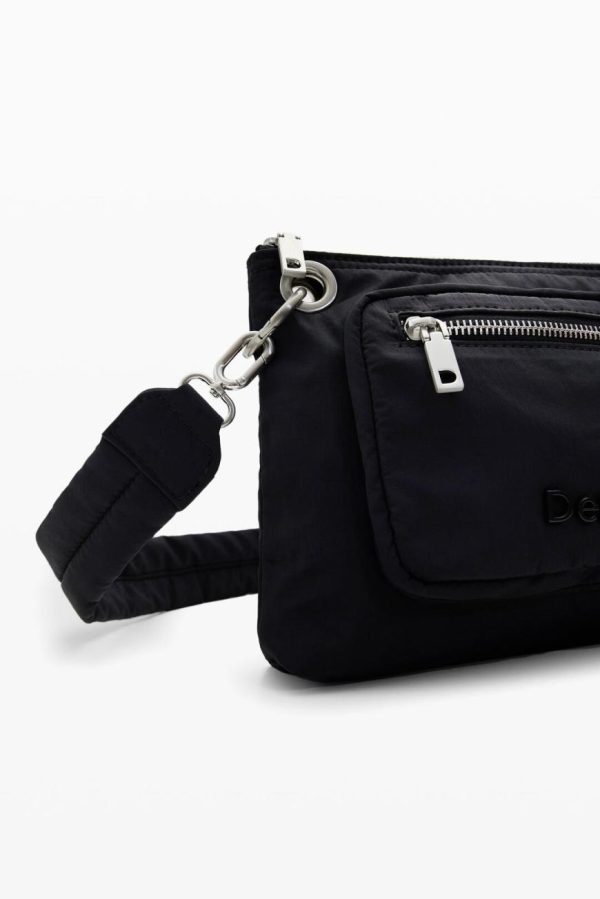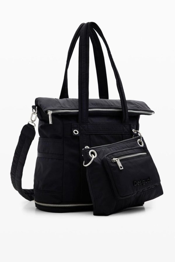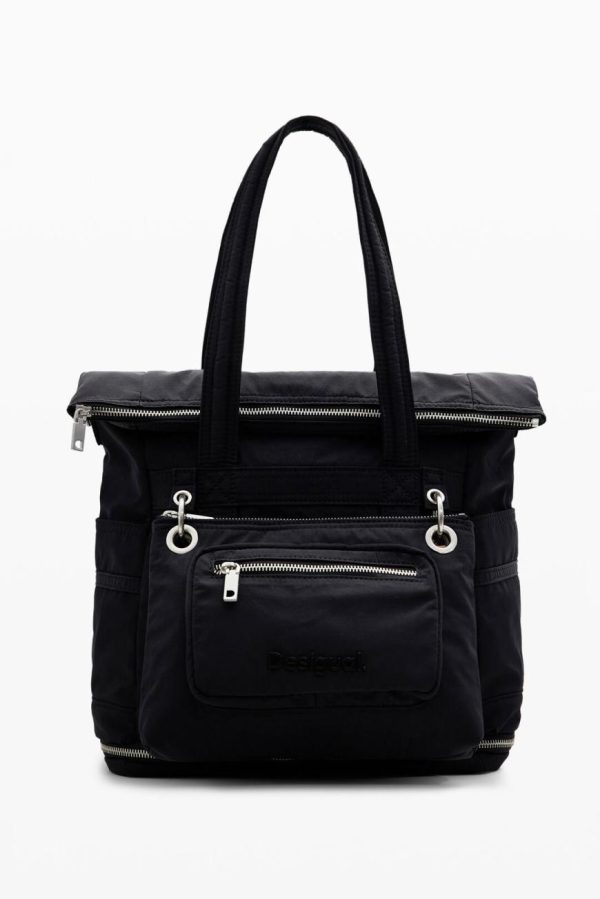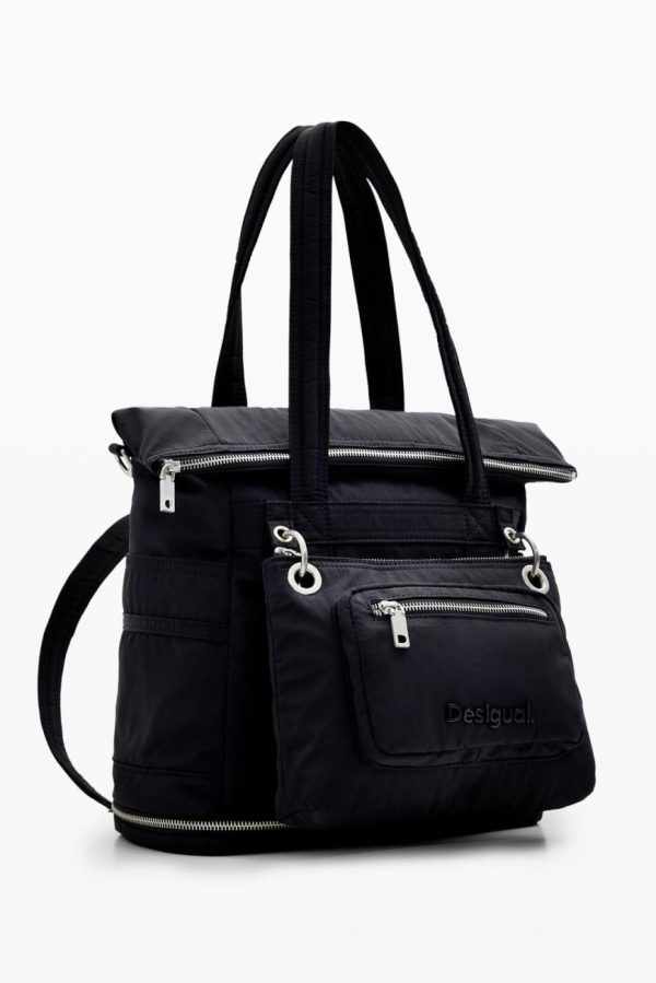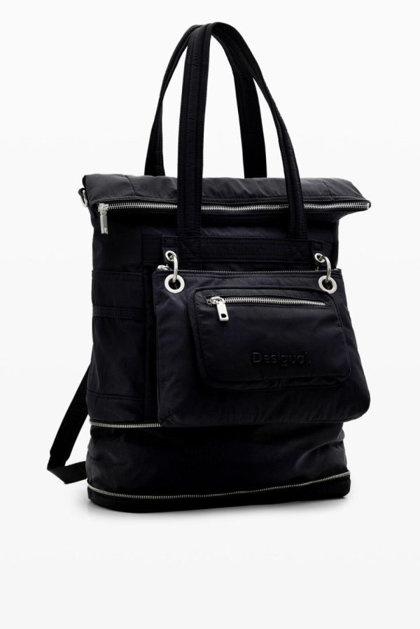 Plain nylon backpack with large capacity and various handles that convert it into a bag. Includes a small detachable shoulder strap and multiple pockets.