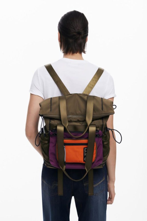 Large capacity nylon backpack with several handles that turn it into a bag. Includes a small detachable shoulder strap and multiple pockets.