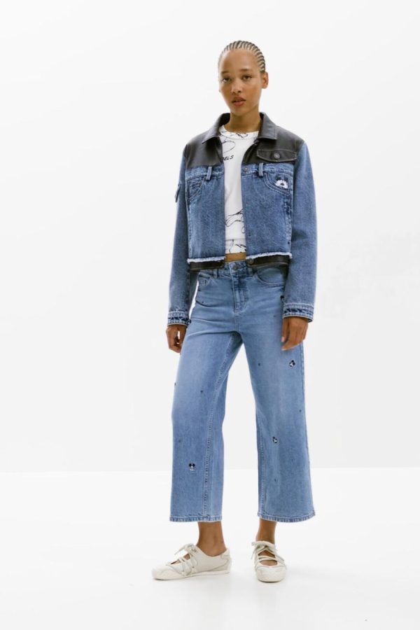 Make a bold statement with this eye-catching bicolor trucker denim jacket featuring a distinctive waxed finish, multiple functional front pockets, and an iconic Mickey Mouse™ print that adds playful charm to your wardrobe.