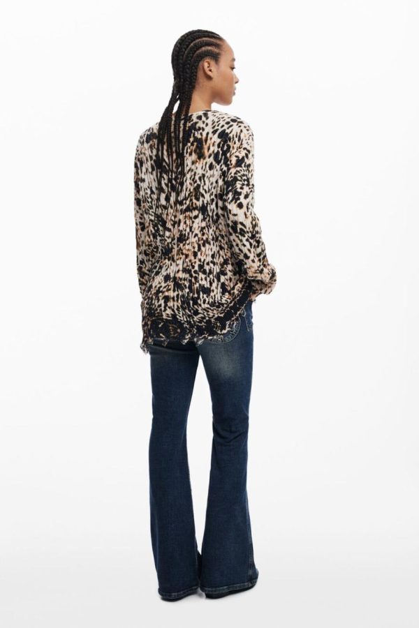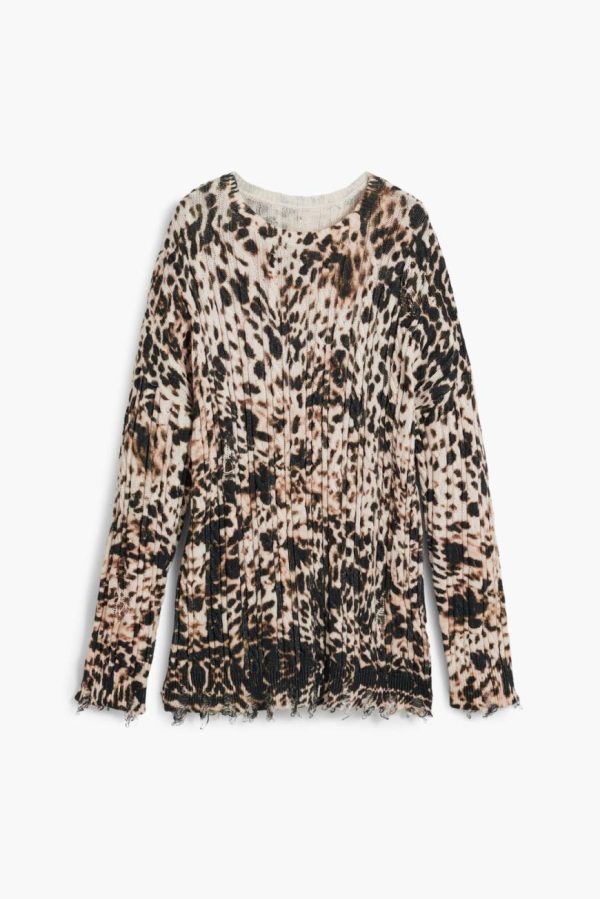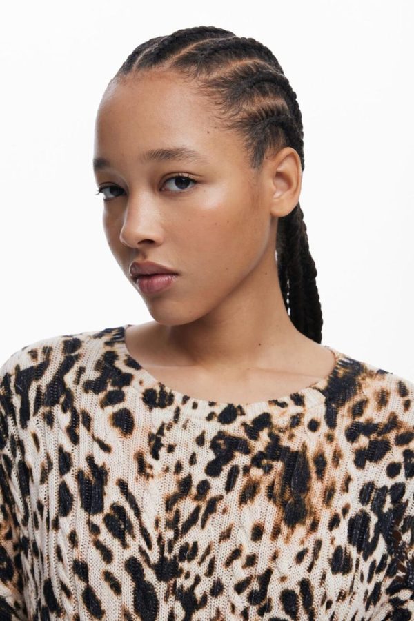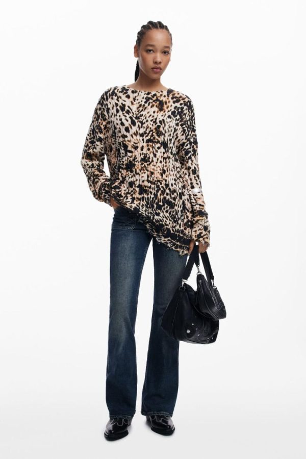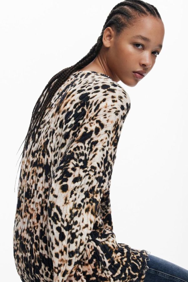 Discover this beautifully crafted fine gauge sweater featuring a timeless round neck and elegant long sleeves with a captivating animal-inspired print that adds a touch of wild sophistication to your wardrobe.