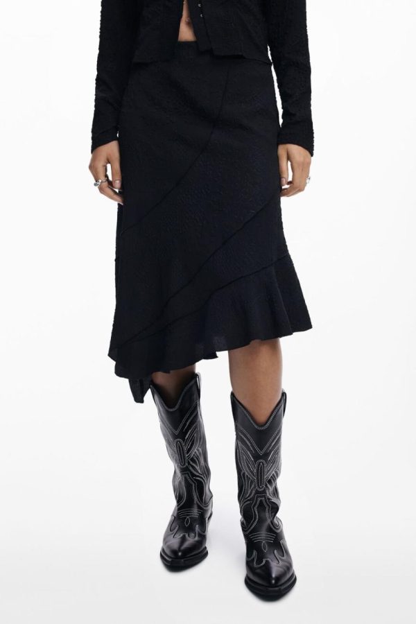 Elevate your style with this chic knee-length skirt featuring eye-catching texture and a modern asymmetrical hem in a versatile solid black color.