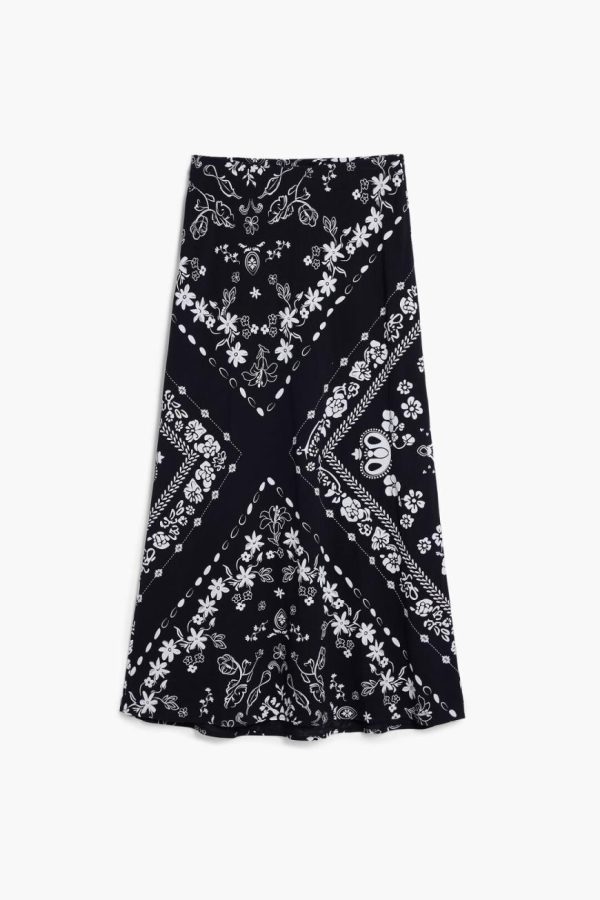 Discover this effortlessly chic midi skirt featuring a soft-touch feel that falls gracefully at the knee, complete with a comfortable elastic waistband and stylish black bandana print design.