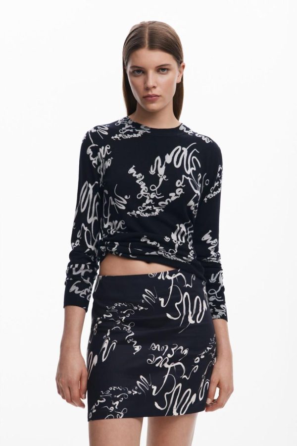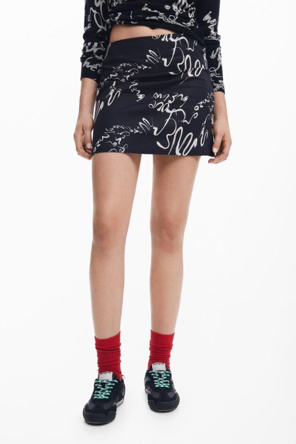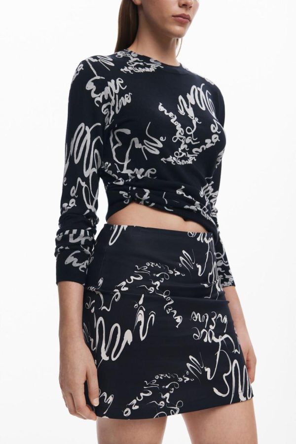 Discover this chic mini skirt featuring a sleek fitted silhouette with bold letter print against a solid black background, complete with a convenient zipper closure for easy wear.