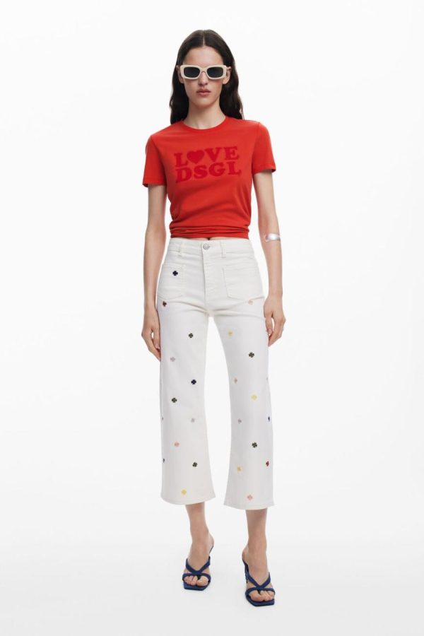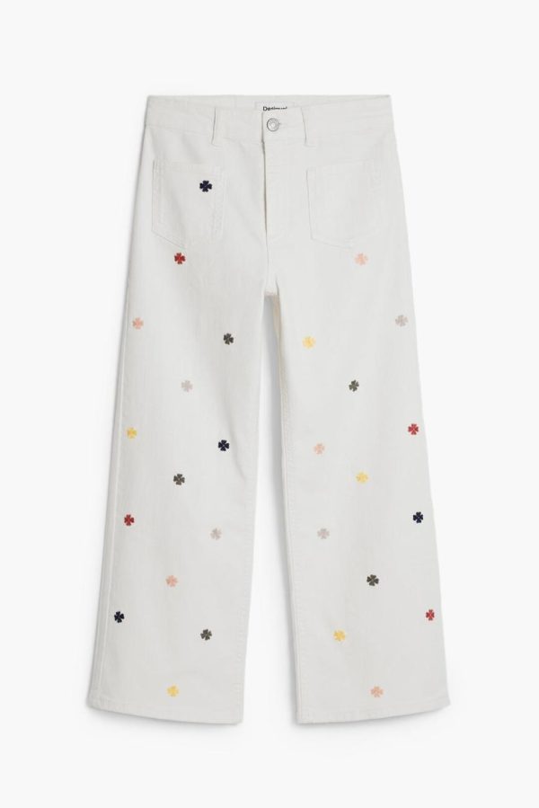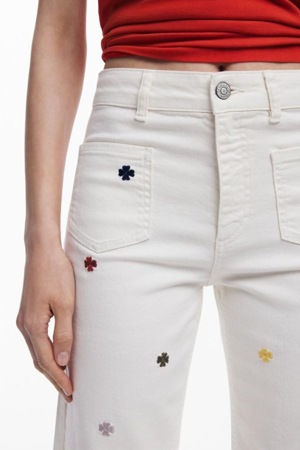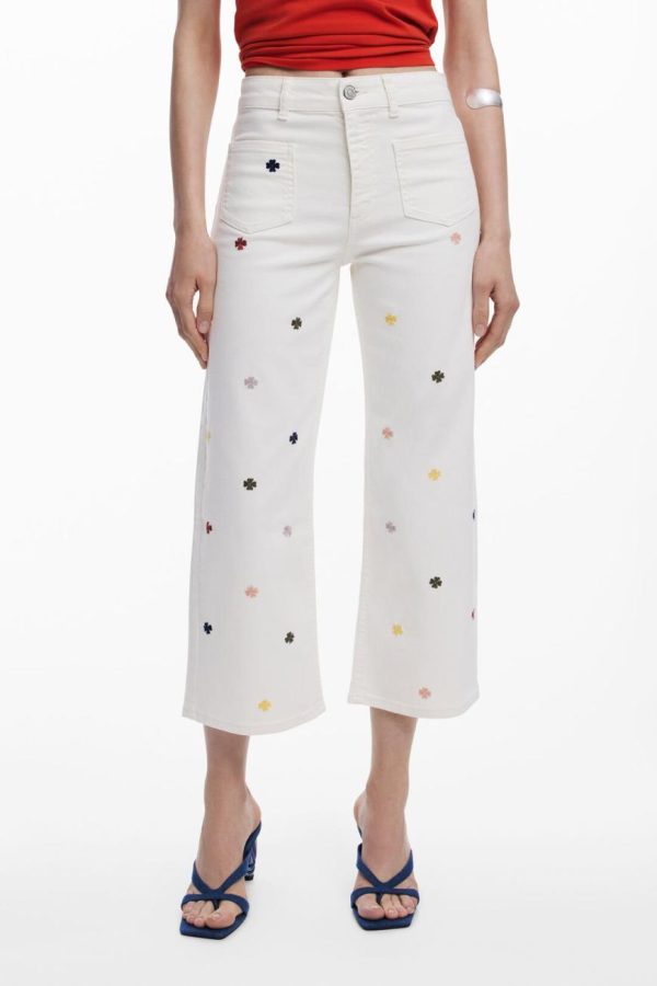 Discover the perfect blend of comfort and style with these fashion-forward culotte-cut jeans featuring spacious front pockets and delicate embroidery accents.