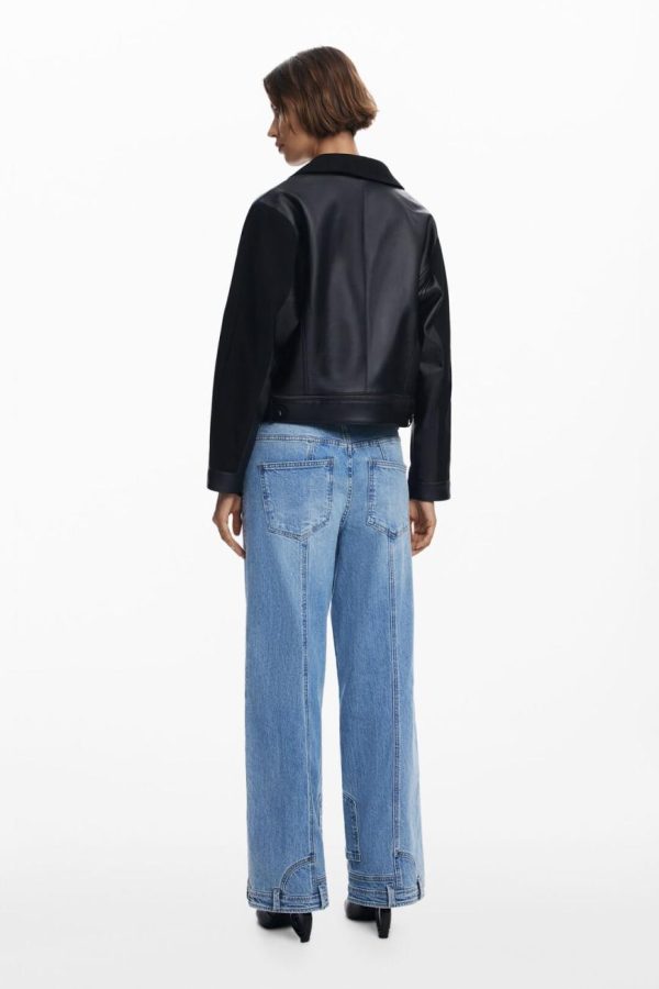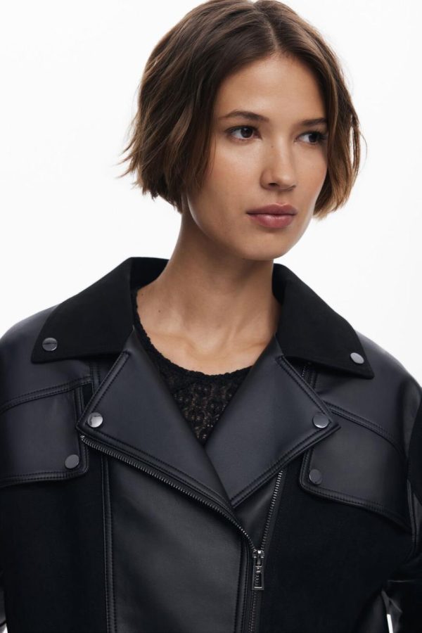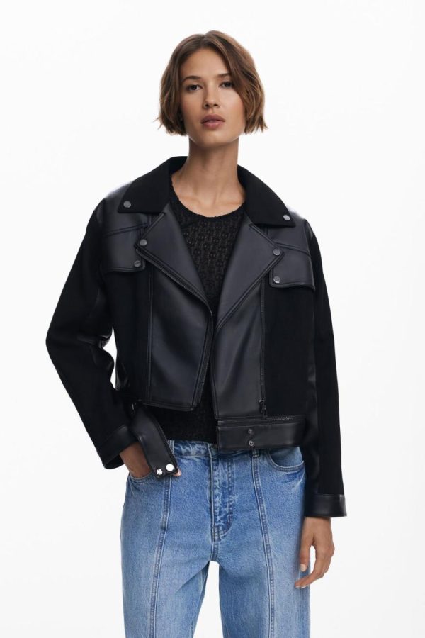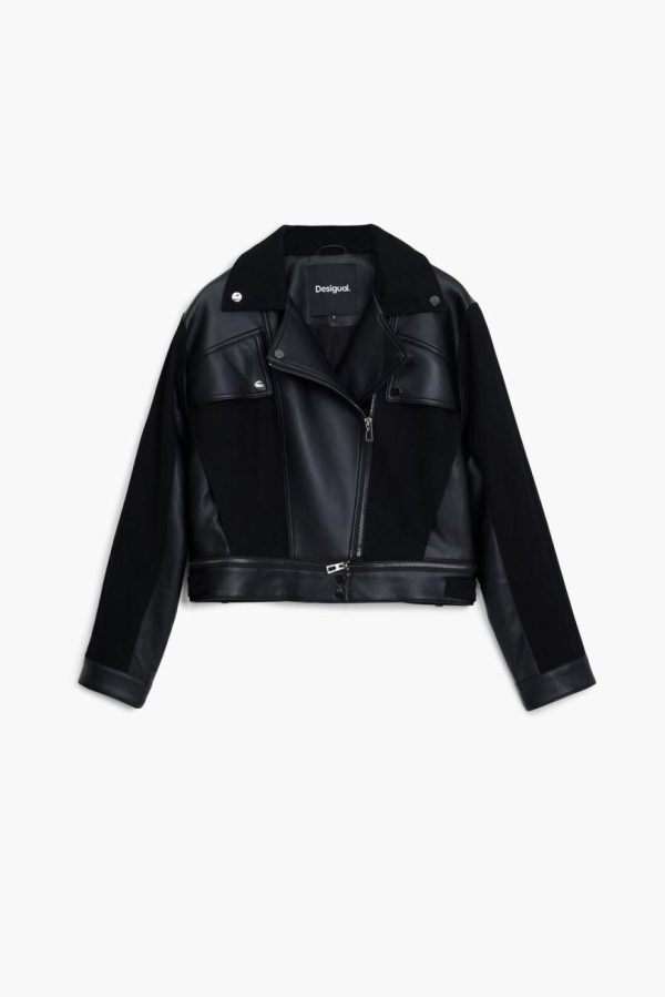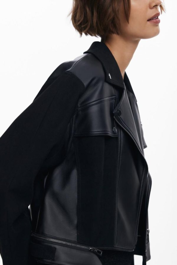 Edgy biker-style jacket featuring premium faux leather with striking cross-zip closure and stylish knit fabric combination on the collar, torso, and sleeves for a contemporary layered look.
