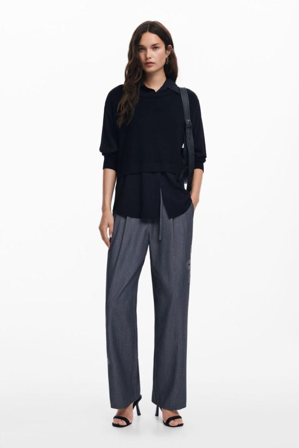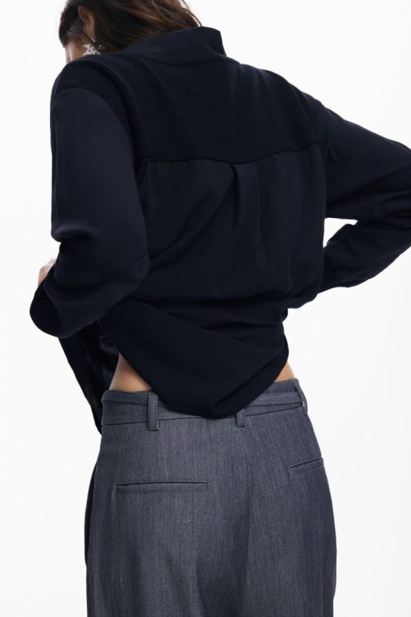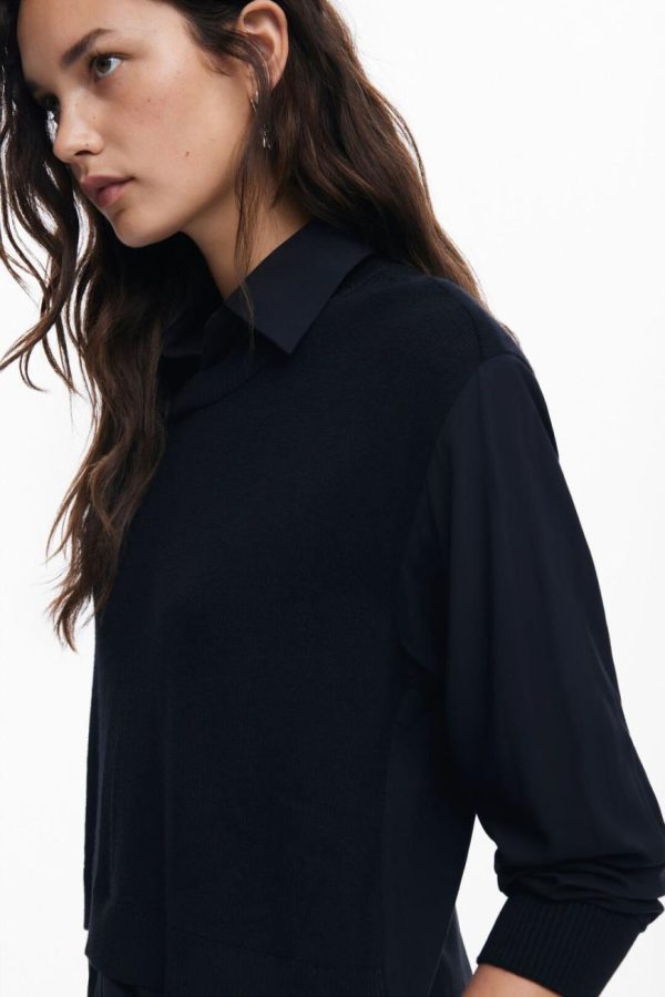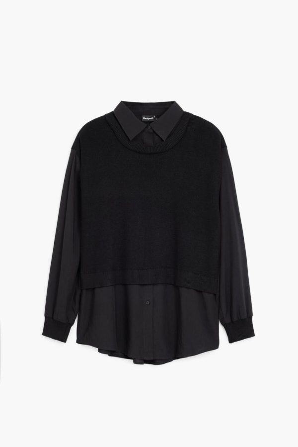 Elevate your wardrobe with this sophisticated long-sleeved shirt featuring a stylish knitted vest overlay and convenient button closure