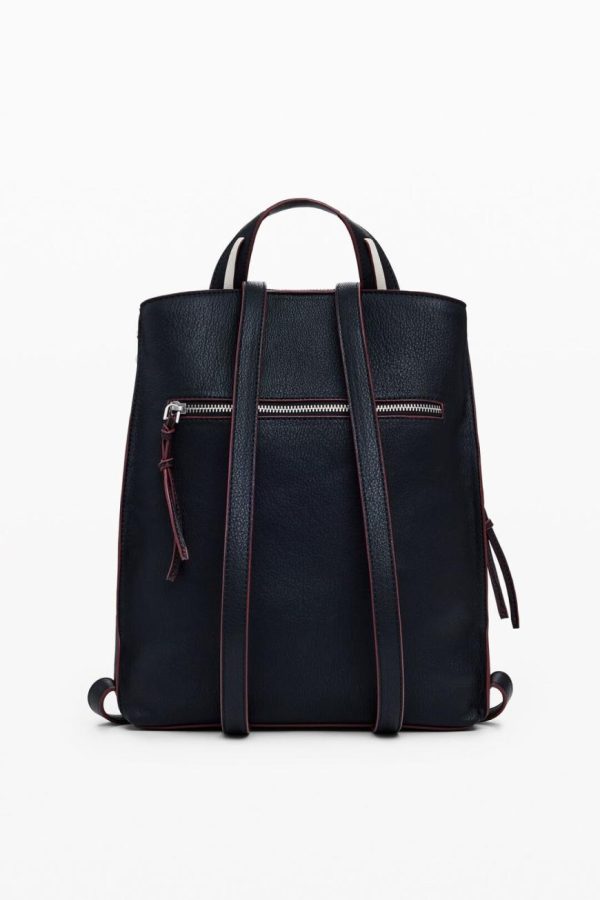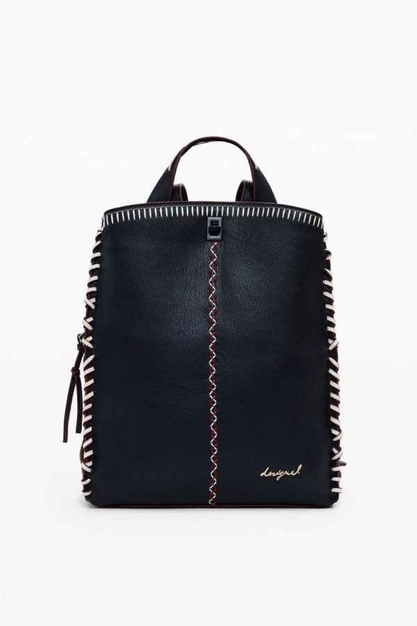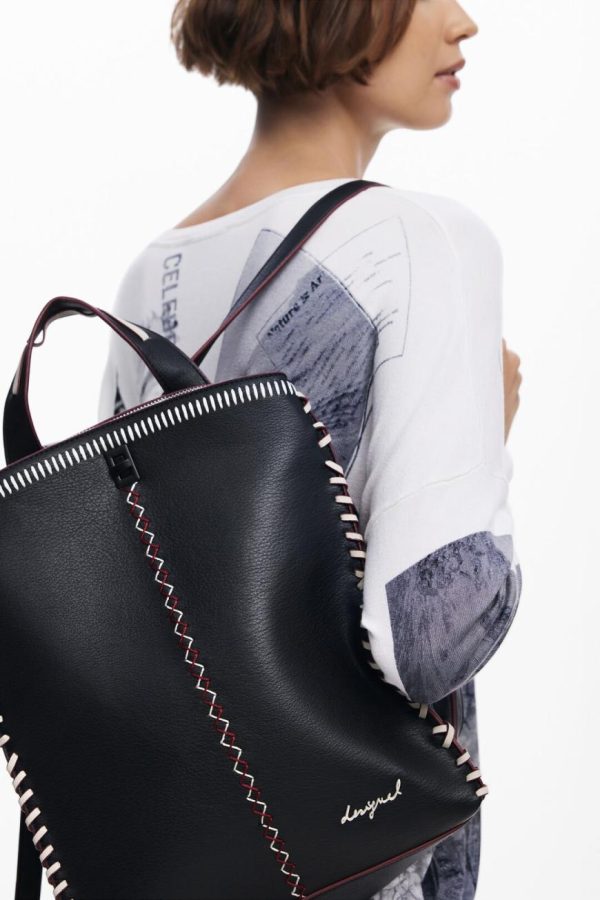 Spacious faux leather backpack featuring eye-catching contrasting stitching, smart organizational compartments, and a convenient removable handbag-style handle for versatile carrying options.