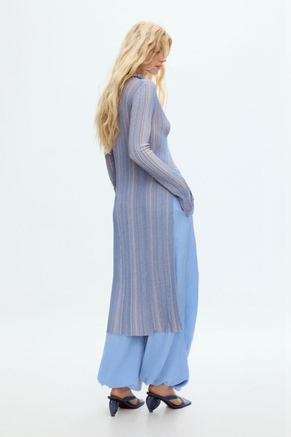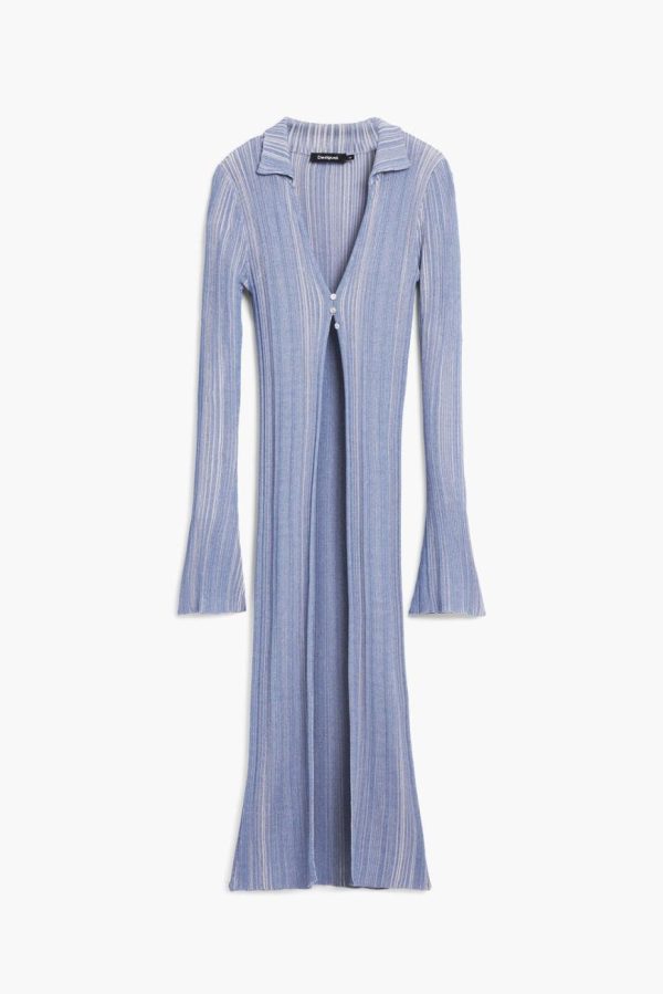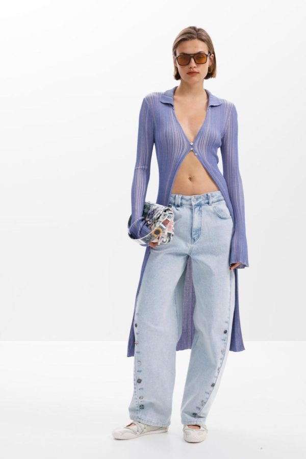 Elegantly fitted cardigan-style sweater featuring a flattering three-button closure at the waist and a sophisticated shirt collar design.