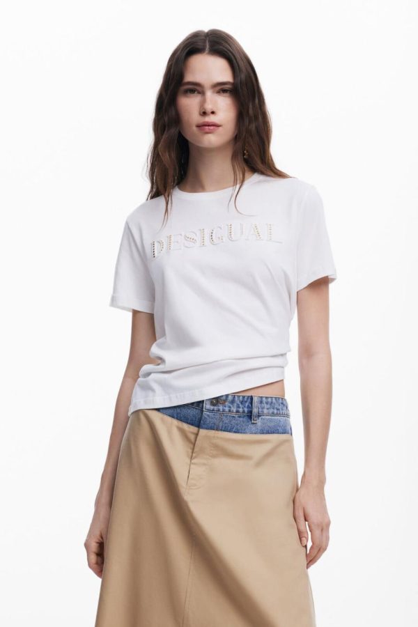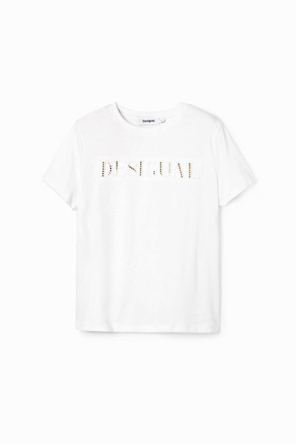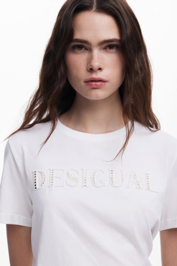 Elevate your casual wardrobe with this stunning short-sleeve T-shirt featuring an eye-catching embossed front logo and sophisticated metallic accents.