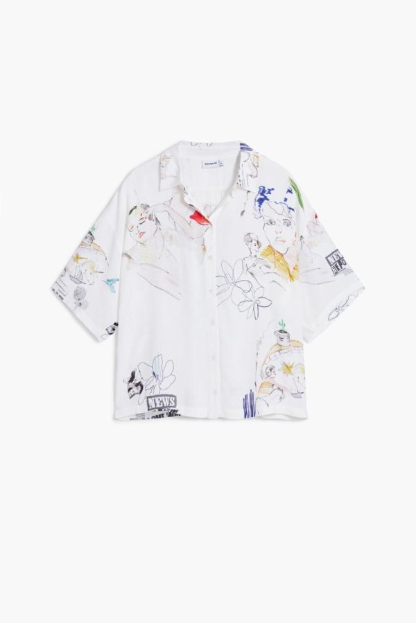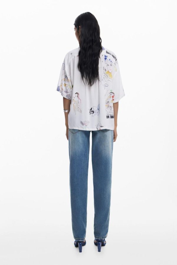 Flowy short-sleeve shirt featuring a playful collection of colorful character illustrations that add artistic flair to your wardrobe
