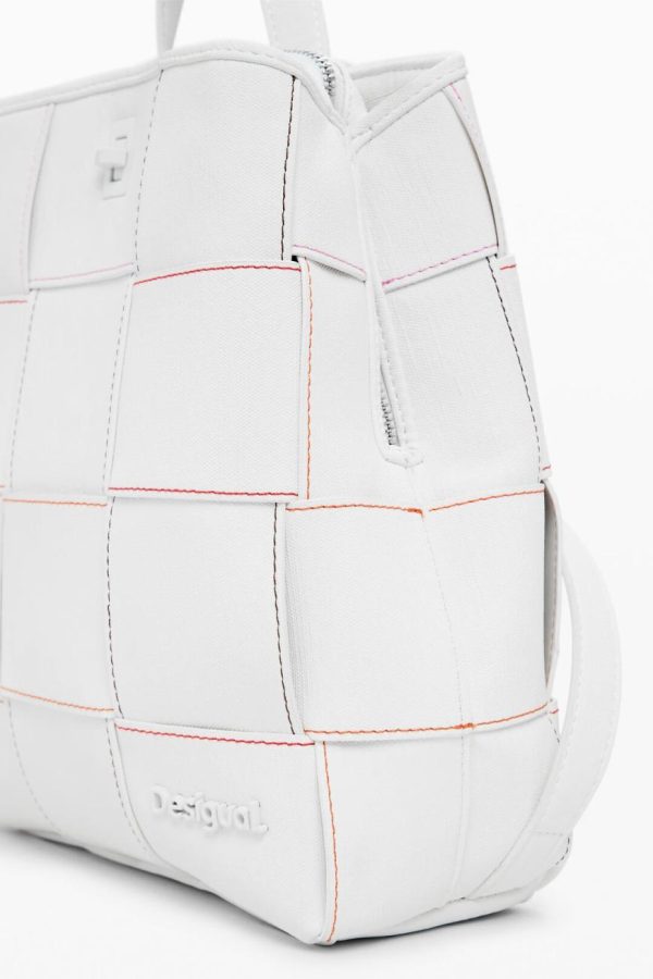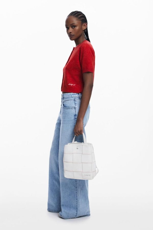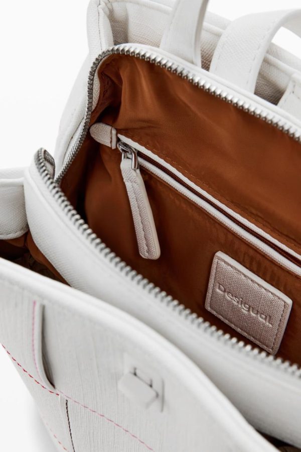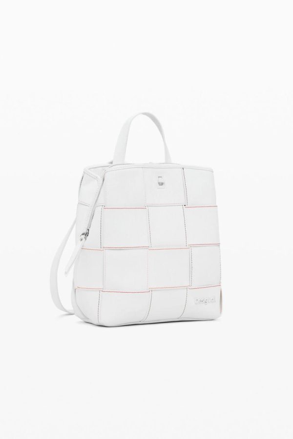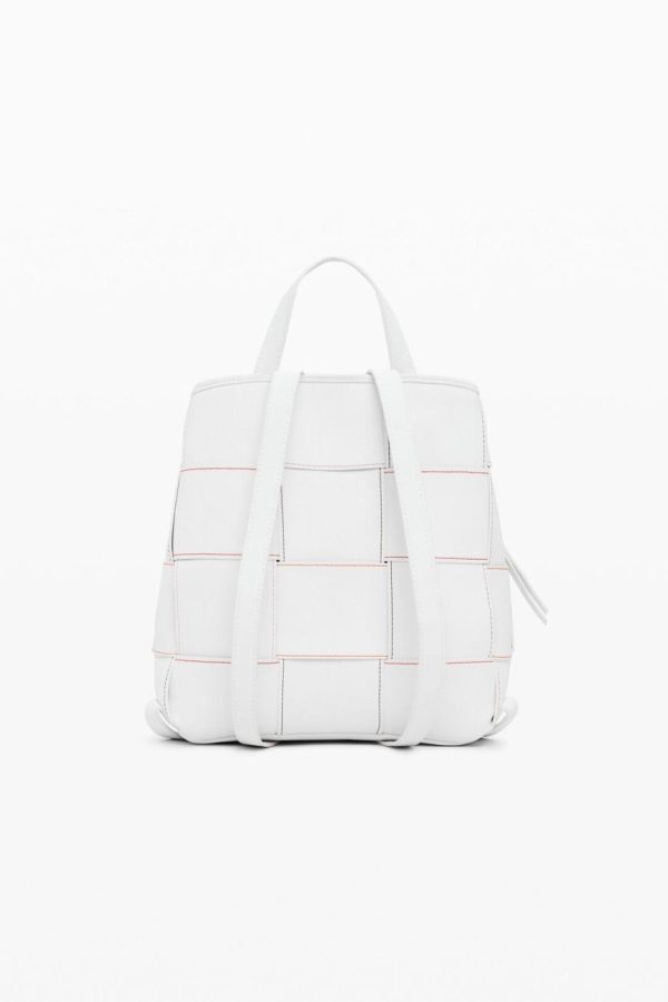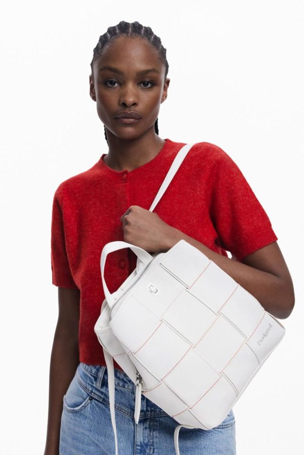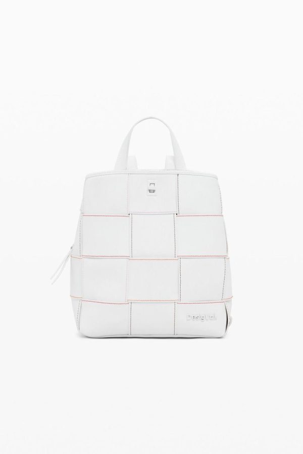 Discover this chic small backpack crafted from premium braided faux leather with striking contrast stitching and signature metallic logo appliqué for a touch of luxury.