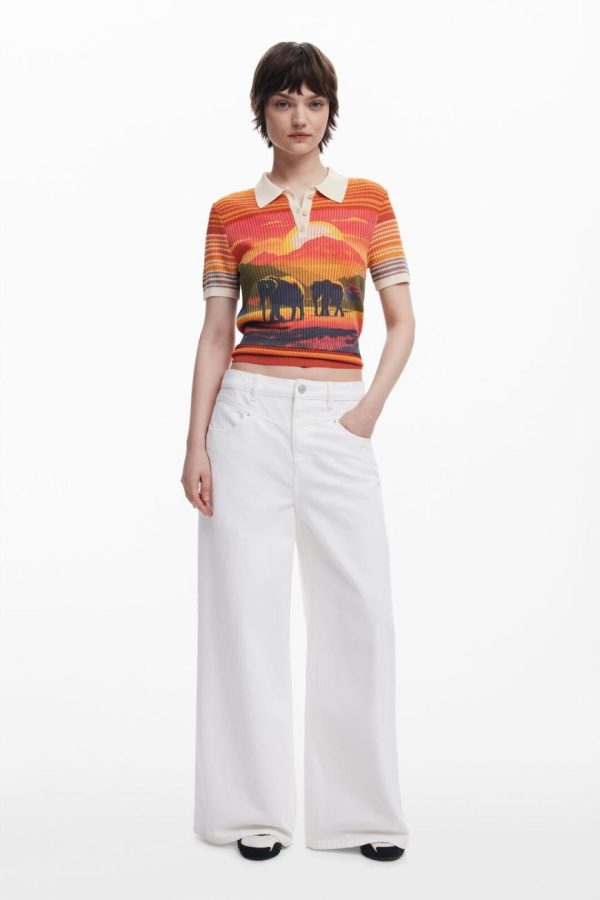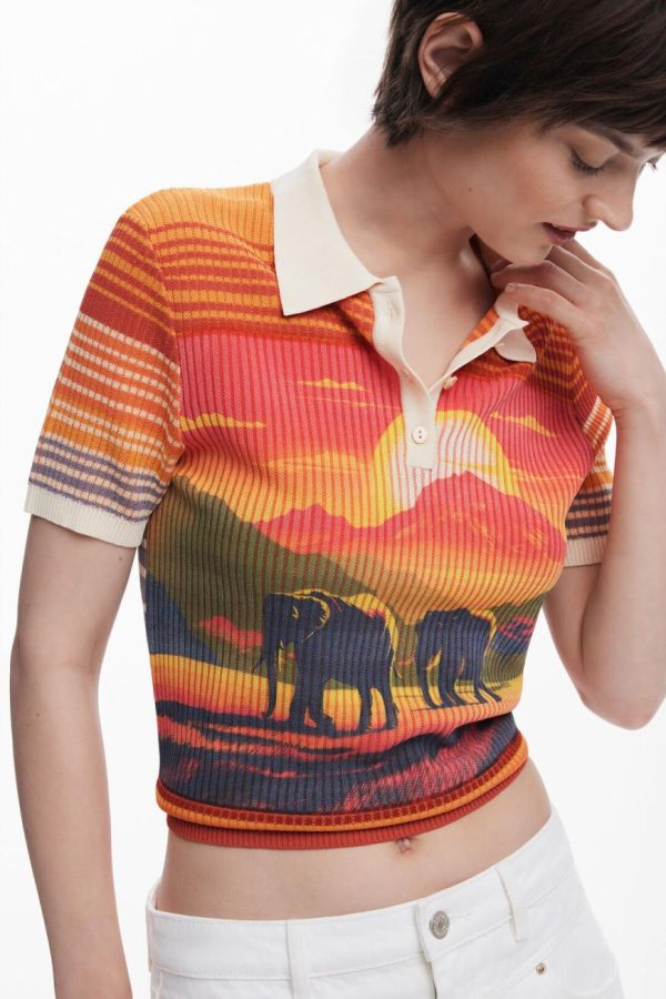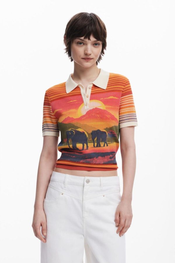 Elevate your casual style with this chic short-sleeve polo-style collar T-shirt featuring a sophisticated button closure and vibrant elephant and landscape print that adds playful elegance to your wardrobe