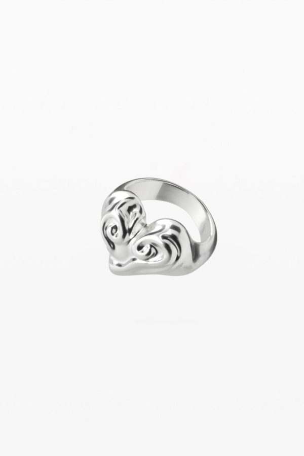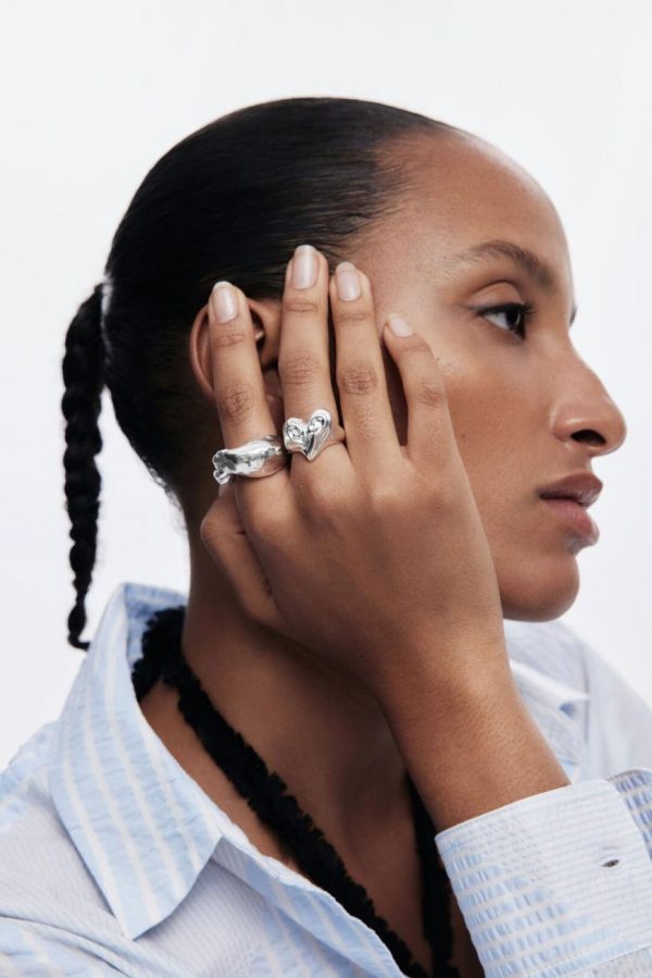Ring in the shape of a heart, hand-molded effect, plated in 1st law silver of 3 micro inches. Zalio x Desigual collection; designed by Gala Meyer.